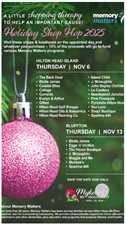 The Holiday Shop Hop for Memory Matters will take place on Thursday, November 6, 2025, on Hilton Head Island, and Thursday, November 13, 2025, in Bluffton. Each participating boutique will donate 10% of sales from the day to Memory Matters, helping to sustain life-changing programs for families affected by dementia and cognitive challenges.